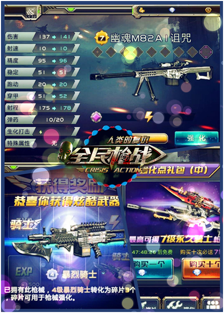 全民槍戰(zhàn)》新版本中加入了增強(qiáng)版槍械強(qiáng)化改裝玩法,收集槍械碎片合成特定槍械,騎士系列、生化系列等20余種槍械皆可合成,為你的軍火庫(kù)添磚加瓦,輕松應(yīng)對(duì)不同的...